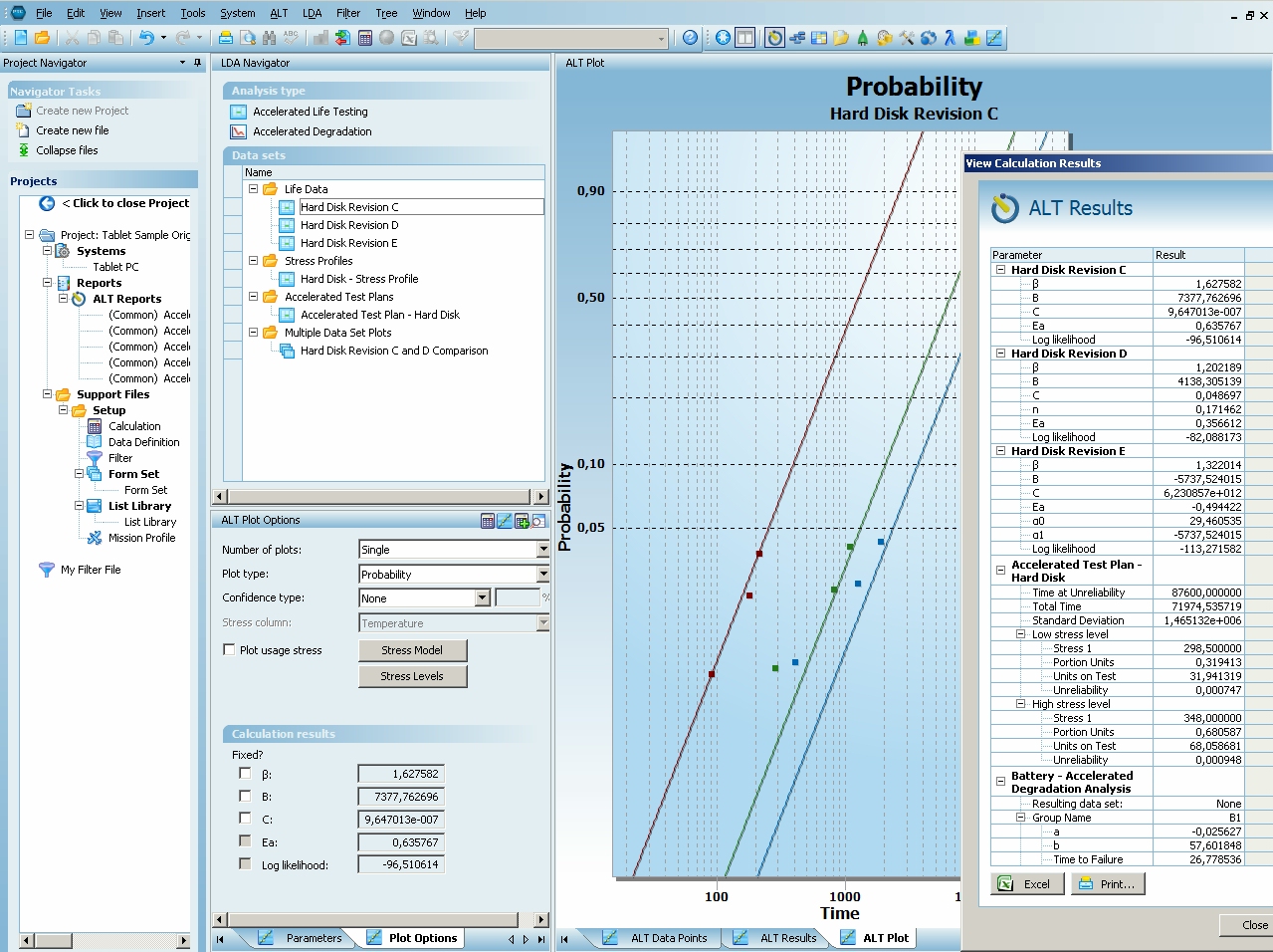 in WQS ALT eingetragen, und ausgewertet. Als Ergebnis kommt eine statistisch abgesicherte mittlere Lebensdauer beim so genannten Usage Stress, oder alternativ eine mittlere Zeitdauer bis zum Erreichen eines festgelegten Degradationslevels heraus.